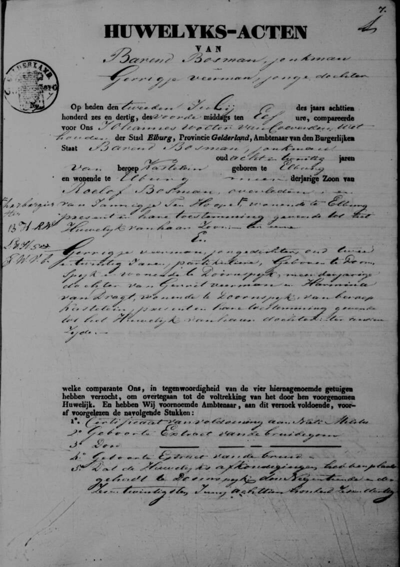 187 jaar geleden gingen Barend Bosman (1808-1864) en Gerrigje Veerman (1814-1855), op 2 juli in 1836 trouwen met elkaar in Elburg.